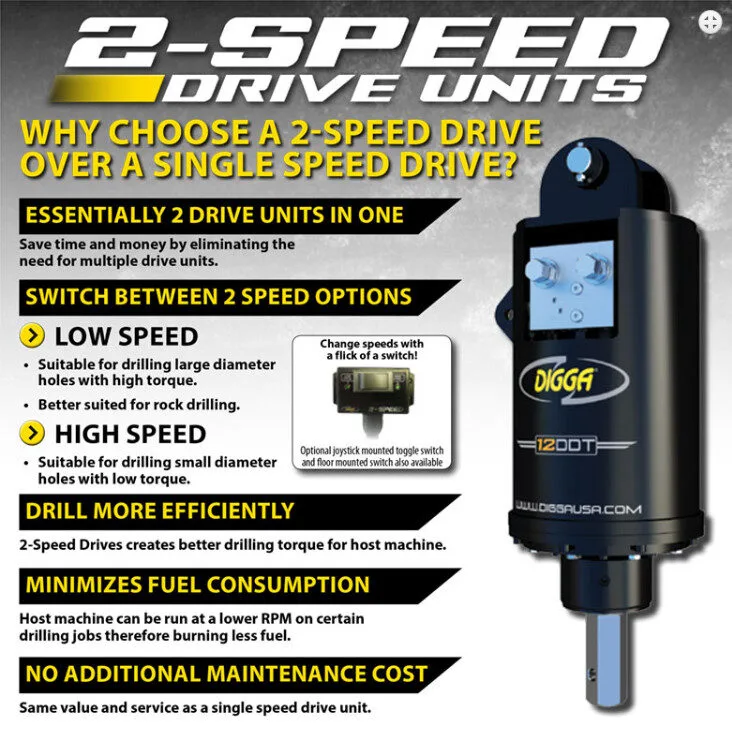 The 7DDT 2-Speed High Flow Auger Drive is a versatile, mid-range drilling solution designed for 8–14 ton excavators. Built for performance and adaptability, this unit features a two-speed motor that allows operators to switch between high torque for tougher ground conditions and higher speed for faster drilling in softer soils.